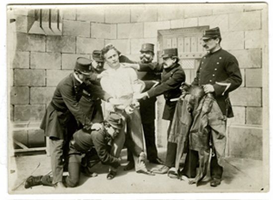 | Photographic portrait of a manacled Houdini being restrained by a group of French policemen | |
