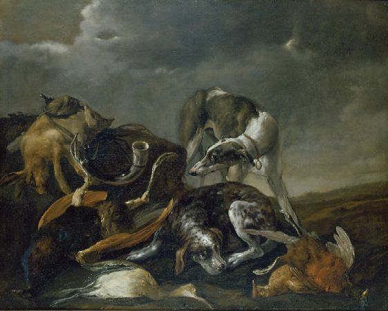 AFTER THE HUNT, A GREYHOUND AND A POINTER GUARDING