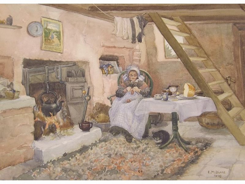 | interior cottage scene with an old lady seated knitting by the fireside | |