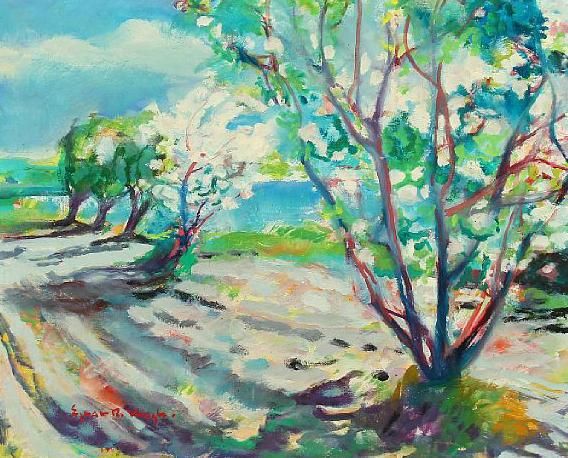 Blooming trees in country landscape