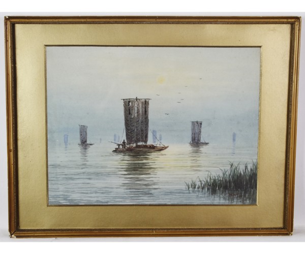 River landscape with fishing boats