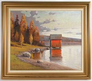 Höstlandskap med sjöbod