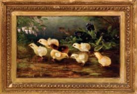 A BROOD OF CHICKS BENEATH WILDFLOWERS.