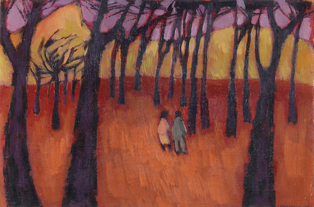Two figures in a wooded landscape