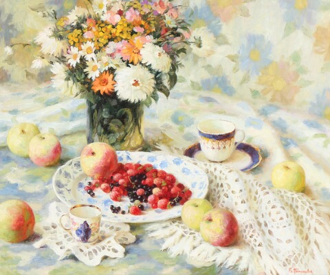 | Still life with teacups, a fruitdish and a bouquet of flowers on a table | |