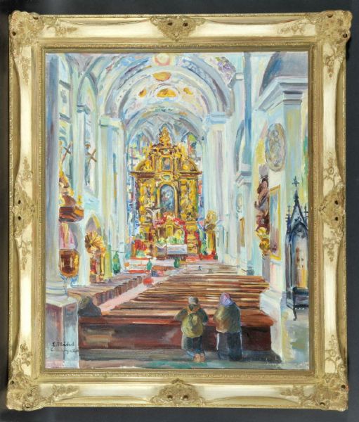 Innenansicht der Stadtpfarrkirche Mariä Himmelfahrt in Landsberg mit betenden Personen