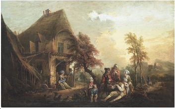 Landskap med hus och musicerande sällskap