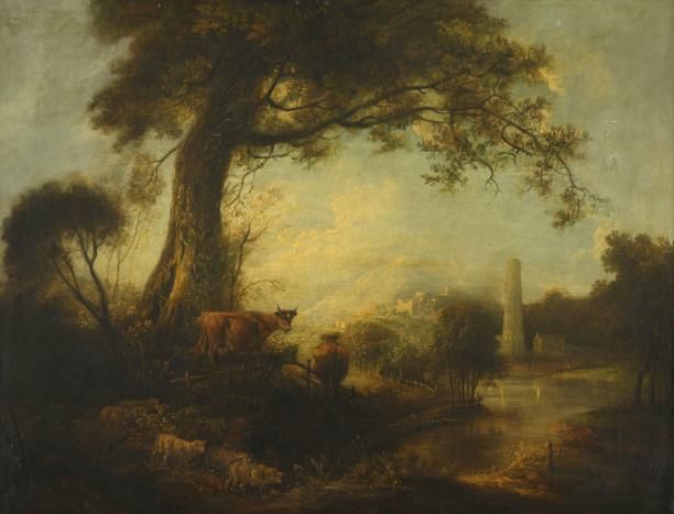 SHEEP AND COWS UNDER A GREAT TREE AT THE EDGE OF A STREAM