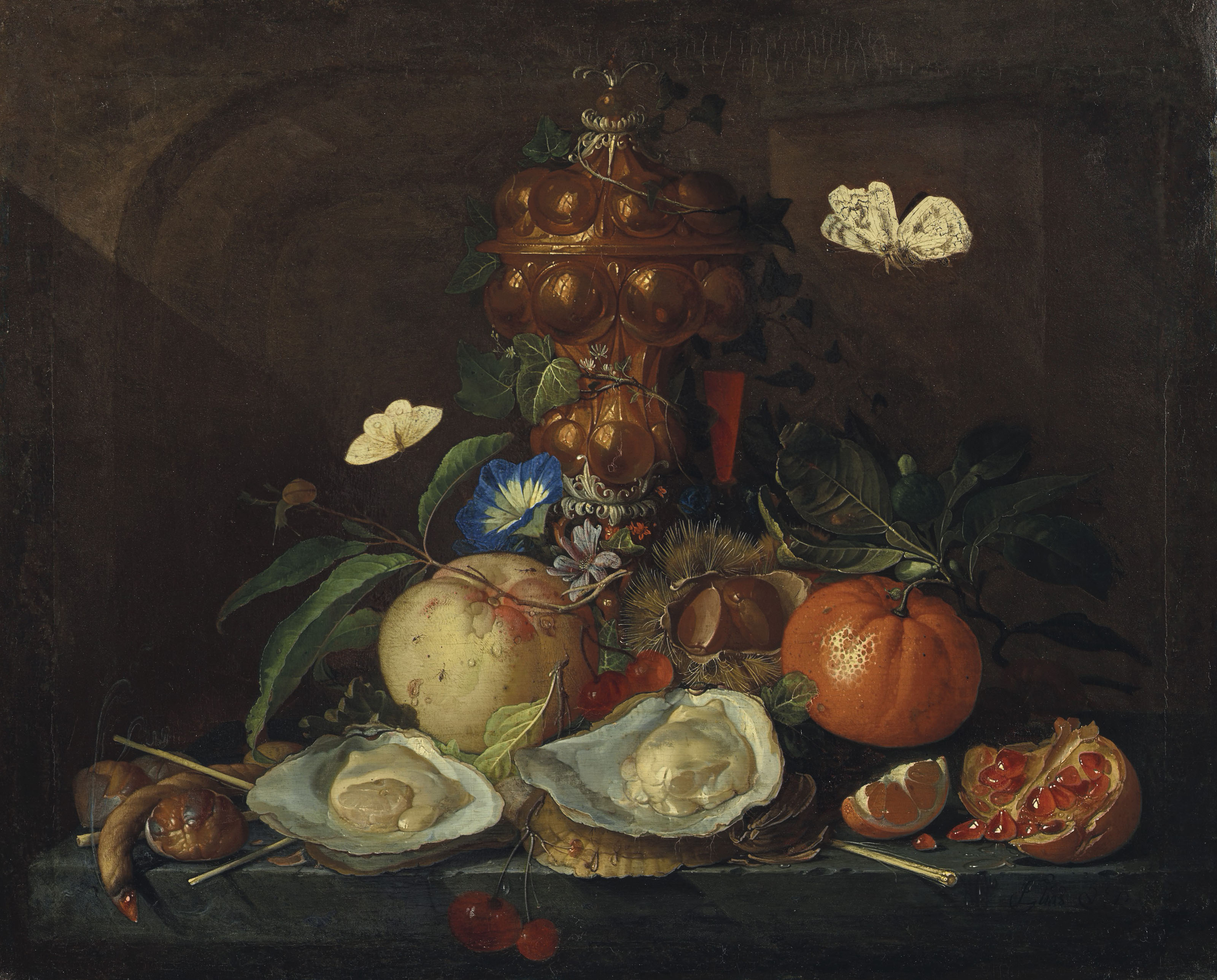 | Nature morte aux huitres, papillons, fruits et hanap | |