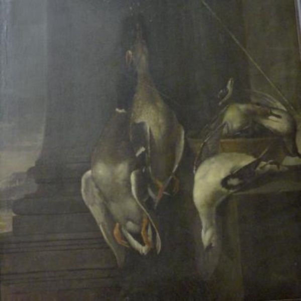 Couples de cols verts, panier de sarcelles sur un entablement