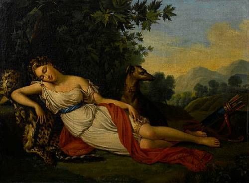 Diana the Huntress and her dog resting in a landscape