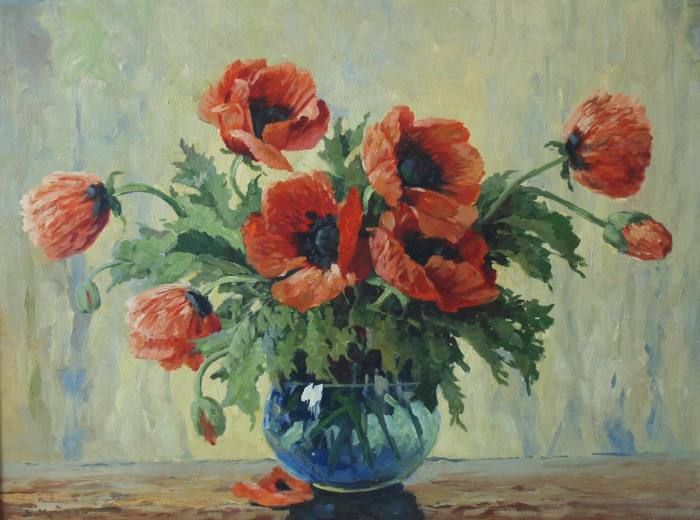 Rote Mohnblumen in Glasvase.