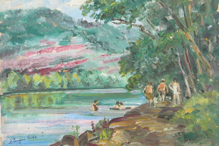landscape with figures on path and swimming