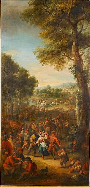 | A military encampment with soldiers dancing and playing cards and horsemen fording a stream beyond | |