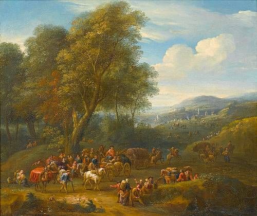 | Travellers merrymaking outside a country inn, a riverside town beyond; and Travellers on a country path, a mountainous landscape | |