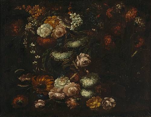 | A still life of a dianthus plant, roses, and other flowers and caterpillers, all resting on a table | |