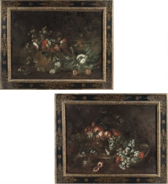 | Peaches, pomegranates, plums and grapes in a copper bowl, hyacinths, anemones, roses and a carnation in a basket, and grapes and | |