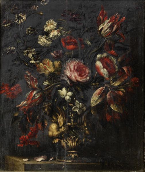 Roses, tulips, narcissi and other flowers in an ornate vase on a stone ledge