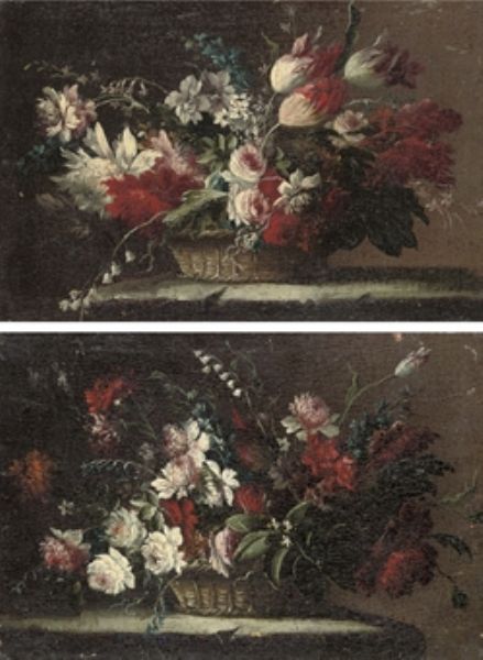 | Tulips, roses, chrysanthemums, morning glory and other flowers in a wicker basket, on a stone ledge; and Roses, chrysanthemums, | |
