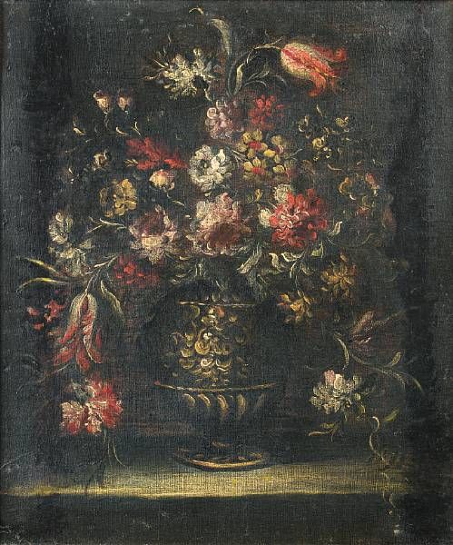 | Roses, tulips, narcissi and other flowers in an urn on a stone ledge | |