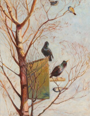 | A birch with birds by a starling box | |