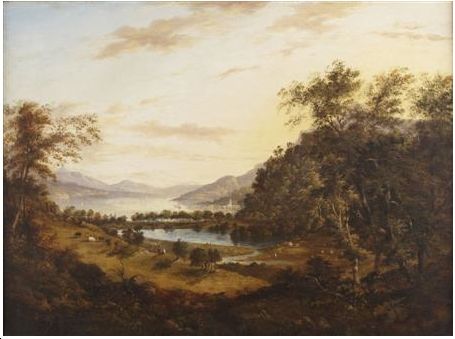 A PANORAMIC HIGHLAND LANDSCAPE WITH DISTANT LOCHSIDE TOWN