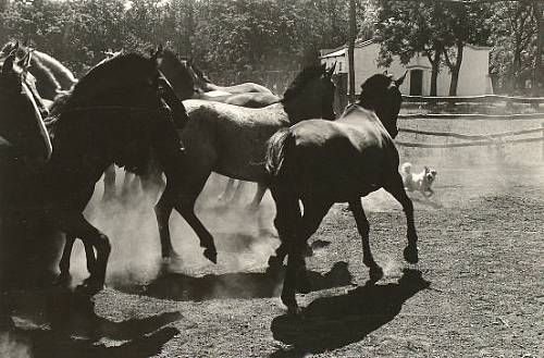 Dog with running horses