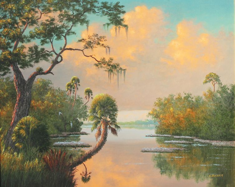 Peaceful River Landscape with Egrets and Sunlit Clouds