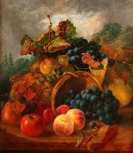| Still Life Study of Pears, Apples, Peaches and Grapes in a Basket on a Ledge, | |