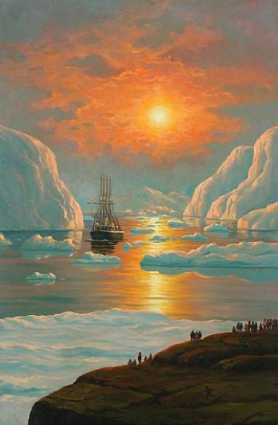 | Greenlandic fiord with ship setting out in the midnight sun | |