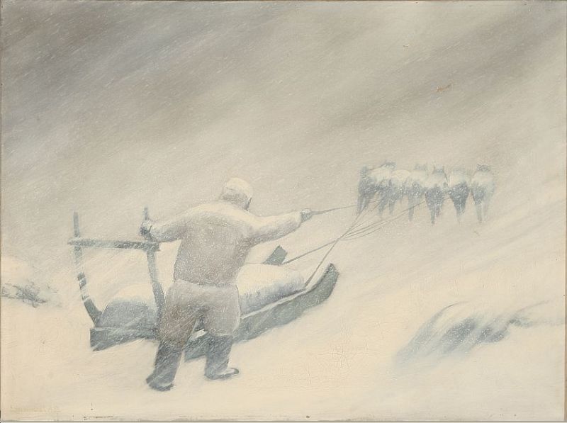 Inuit with a dog sledge in a snow storm