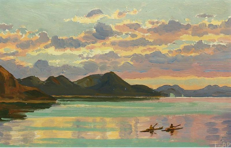 | View from a Greenlandic firth with reddened sky and two kayaks | |