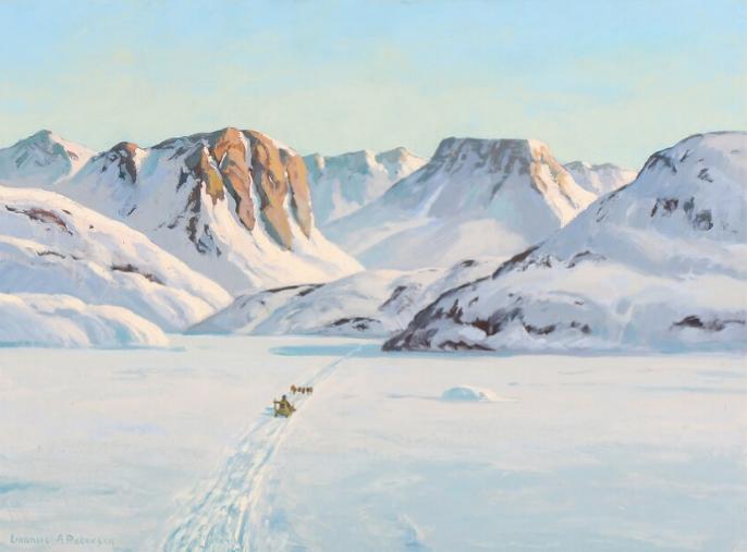 | View from Greenland. A dog sledge making its way towards snow-covered mountains | |