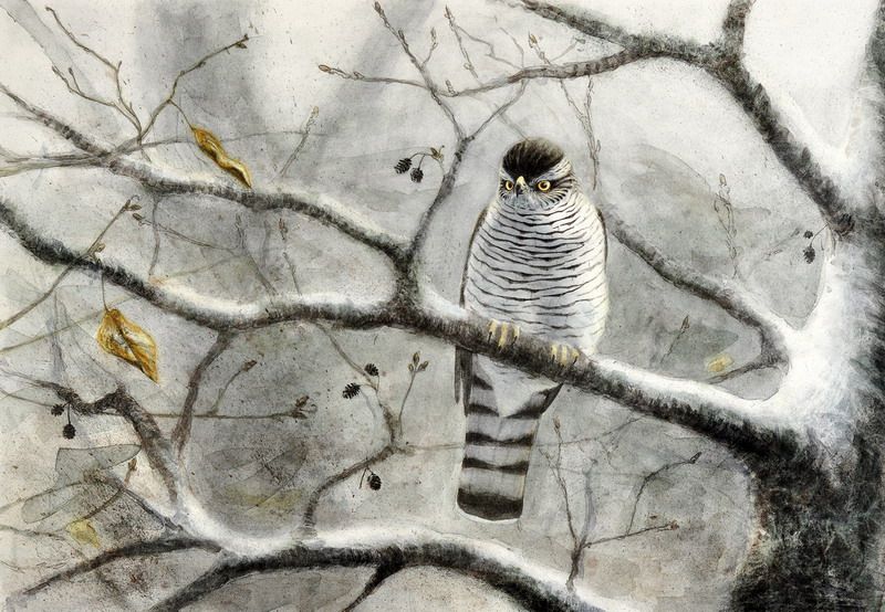 Vinter med duvhök på gren