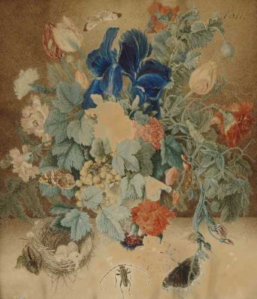 Stillleben mit Blumen, Insekten und Vogelnest.