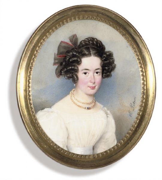 | A young lady, in white dress with voluminous sleeves, double strand gold necklace with sapphire clasp, drop-pearl earring | |