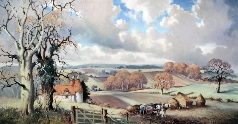 | Rural landscape with a figure ploughing by an oast house (thought to be in Waldron, Kent) | |