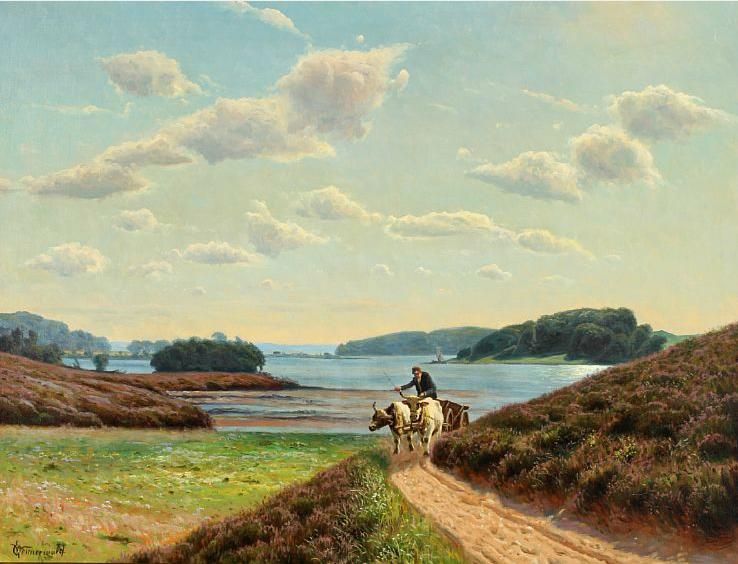 | Landsacpe with ox-drawn cart on a path in the background view over a inlet. | |