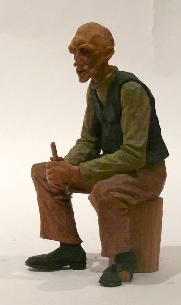 Trä, delvis bemålat. Äldre man i mörk väst