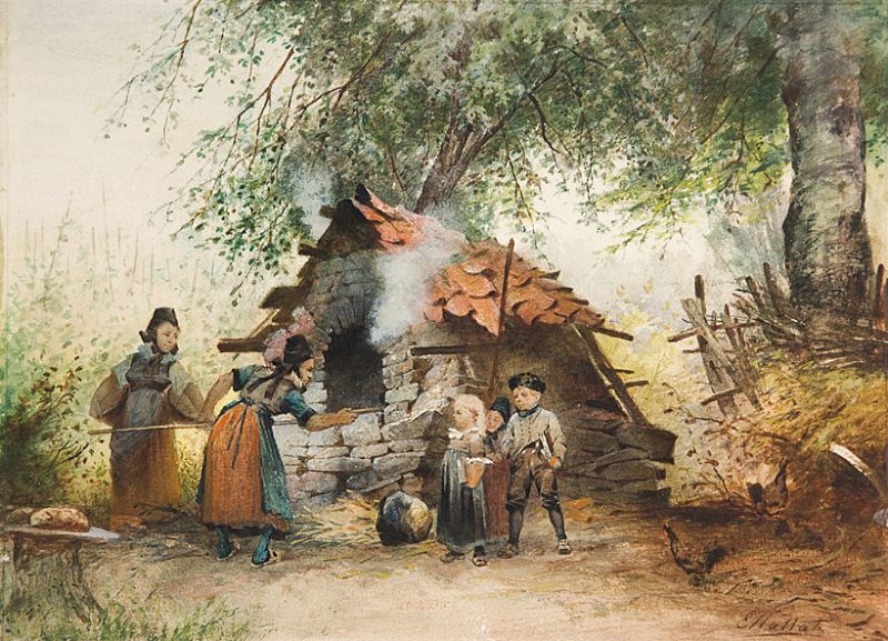 Zwei Landmädchen beim Brotbacken in westfälischer Tracht