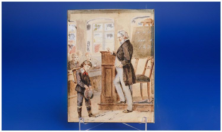 depicting a Victorian Schoolroom with the Schoolmaster hearing the pupil's excuse for lateness.