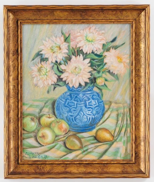 Stilleben med dahlior och frukt