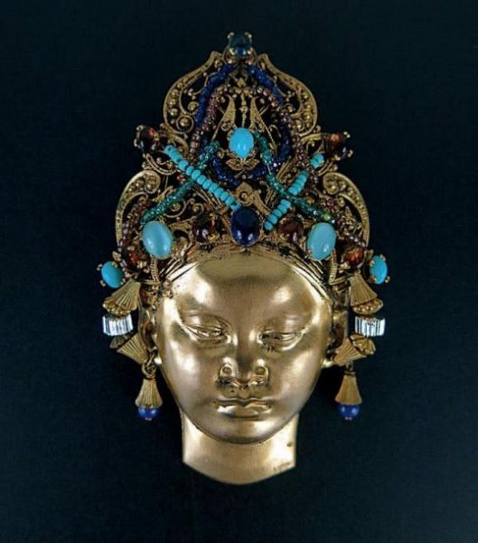 | Visage de cambodgienne formant pendentif broche en métal doré rehaussé de pierres fantaisies | |