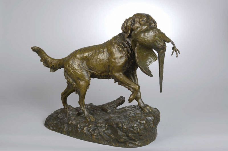 Epagneul tenant une poule faisane dans sa gueule
