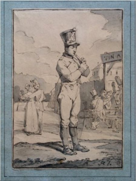 Soldat jouant de la flûte devant un cabaret