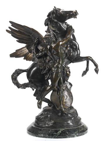 A patinated bronze equestrian figural group of Pegasus and Perseus
