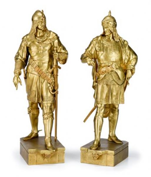 | Bronze gilt patina, modeled as men in Persian military attire, swords at their side, raised on rectangular bases, 2 items | |