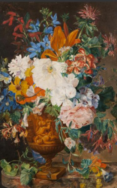 Still life of insects and flowers in a terracotta vase