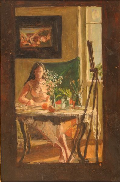 | Portrait of a Young Woman seated at a Table near Brushes and an Easel | |