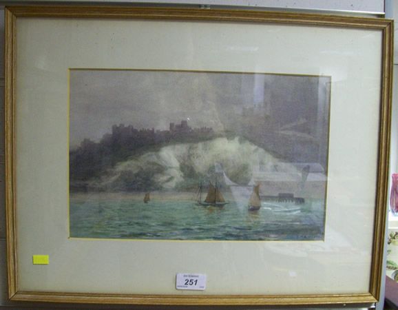 | Dover Castle, with the white cliffs, sea and sailing boats in the foreground | |